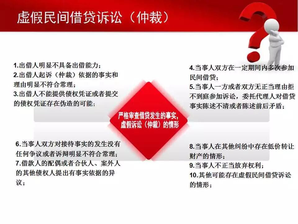 结合长期对裁判机构实践的调研结果,《规定》采取综合判断的规范模式,并列举了判断可能属于虚假民间借贷诉讼(仲裁)的十种行为(第十九条)。主要要求裁判机构在审理民间借贷纠纷案件时要就借贷发生的原因、时间、地点、款项来源、交付方式、款项流向以及借贷双方的关系、经济状况等事实作出综合判断。